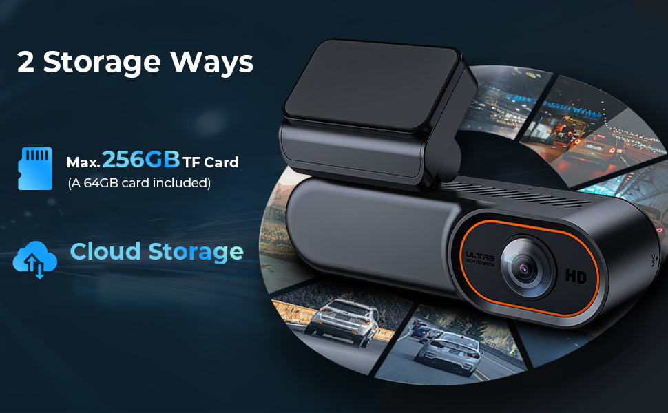 - A stolen front dash cam for car or a corrupted card doesn’t have to mean lost evidence. With dual local and cloud storage, you’re always protected. Record directly to the included 64GB card (supports up to 256GB), or automatically save videos to the cloud—ensuring access even if your hardware is compromised.