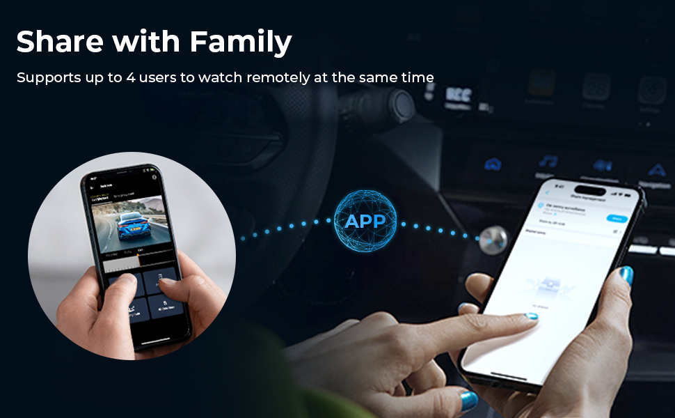 - Stay linked to your vehicle—and your loved ones—with the Share with Family feature. Now, up to 4 family members can remotely watch live footage from your front dash cam at the same time, turning every drive into a shared experience. Whether you’re updating parents on a safe arrival, letting your partner track the kids’ school run, or simply sharing scenic road trip moments, connection is just a tap away.