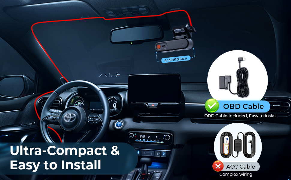 Installation is simple with the included OBD cable (no complex wiring required). Just plug the OBD connector into your car’s OBD-II port (usually under the dashboard) and mount the ultra-compact (4.13in/10.5cm) car security camera on the windshield. ACC cable installation is not recommended due to its complexity, so we provide OBD as the primary option for user-friendly setup.