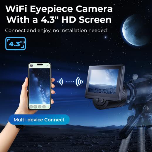- Upgrade your telescope instantly. The 4.3-inch HD screen removes the limitations of traditional eyepieces, reduces eye strain, and makes it easy for everyone to view together. Capture high-definition cosmic photos with one tap and share them wirelessly to your phone, turning every stargazing session into a memorable moment.