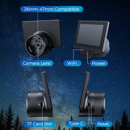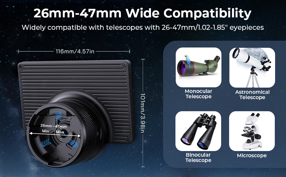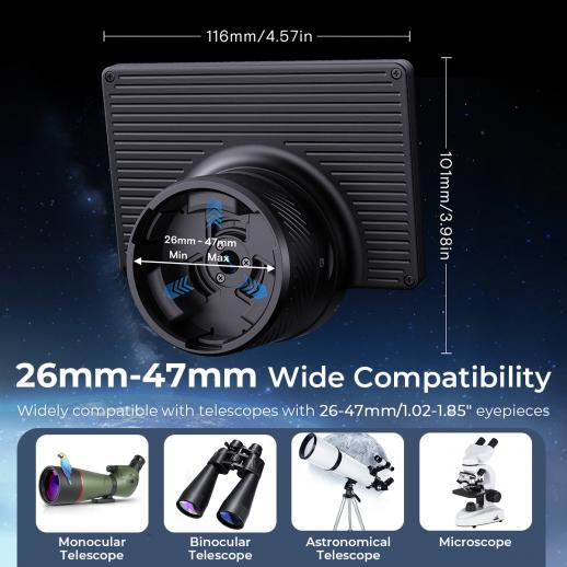 - * Universal Fit for Telescope, Binoculars, and More: One WiFi telescope camera for all your optical gear. The highly versatile, adjustable clamp securely attaches to any eyepiece with a diameter from 26mm to 47mm (1.02” to 1.85”). Effortlessly switch it between your astronomical telescope, binoculars, monoculars, and even microscopes.