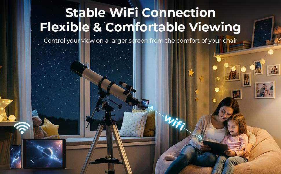 - * Wireless Viewing on Your Phone & Tablet: Enjoy the freedom to observe from anywhere. Built-in WiFi streams the live view directly to your smartphone or tablet up to 33 feet (10m) away. Stay comfortable indoors or share the view simultaneously on 2 devices, allowing you and your friend to enjoy the cosmic show on your own screens.