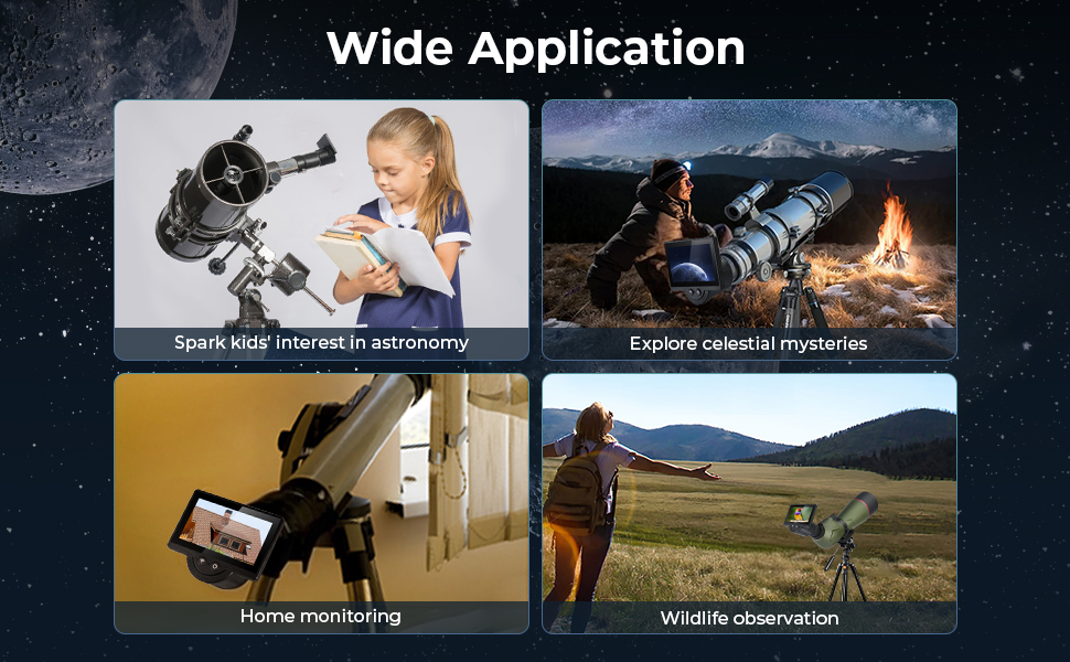 - * Large 4.3in Screen, No More Squinting: Instantly replace your small eyepiece with a large, brilliant 4.3-inch HD screen. It eliminates eye strain and transforms stargazing into a shared group activity. Everyone can gather around to see a bright, vivid live view of the Moon and planets, making stargazing more interactive.