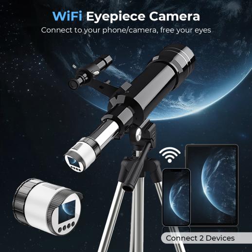 - * Wireless Freedom, Enjoy on a Bigger Screen: With the built-in WiFi, the telescope eyepiece camera lets you stream the live image directly to your phone or tablet. Sit back, relax, and watch the cosmos from a better angle while your telescope stays perfectly positioned. Ideal for sharing with family, classroom demonstrations, or group skywatching nights.