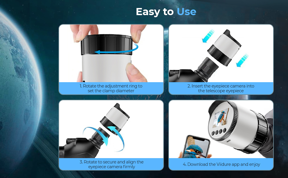 - * Universal Fit for Telescopes, Binoculars & More: Compact and lightweight, this WiFi telescope electronic eyepiece fits effortlessly in your gear bag. Its adjustable clamp fits most telescopes, monoculars, binoculars, and microscopes with a 36–73 mm (1.46–2.87 in) barrel diameter. Whether you’re stargazing, birdwatching, or studying microbes, it upgrades your view instantly.