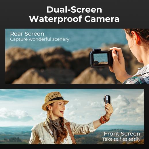The underwater camera for snorkeling is equipped with 2 HD screens: a large rear screen for regular scenery capturing, and a small front screen for taking selfies. With a single press of a button, you can easily switch between 2 screens, just as easily as switch screens on your phone.