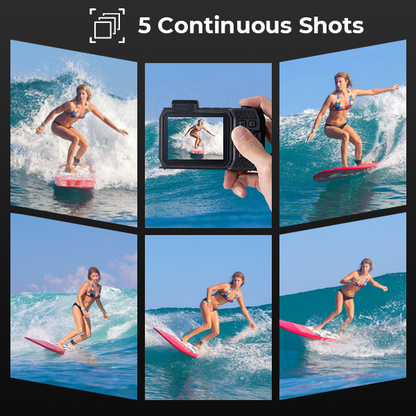 The continuous shooting feature allows you to take 3 or 5 continuous shots with a single press of the shutter button. Perfect for capturing every moment of excitement while surfing, swimming, and skiing.