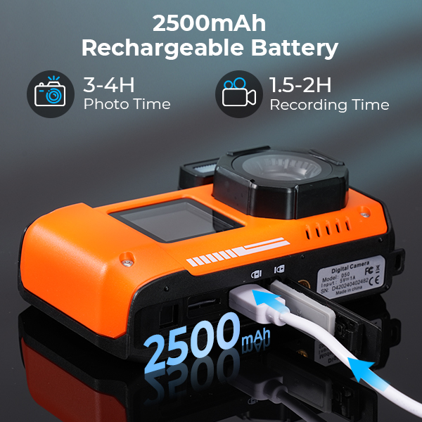 - * LONG BATTERY LIFE & SOS LIGHT Equipped with a 2500mAh rechargeable battery, the 4K digital camera can be used for 3-4 hours of photo taking or 1.5-2 hours of video recording on a full charge. Comes with a USB-C charging cable, it takes about 2-3 hours to fully charge. Plus, when the unexpected danger comes, the one-button SOS flashing light will attract the rescuer's attention, and you'll escape from danger in time.