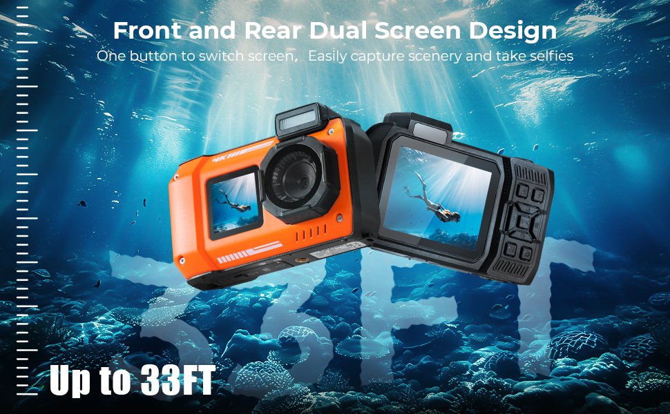 - * 33FT/10M UNDERWATER CAMERA With waterproof capabilities up to 33ft/10m, the waterproof digital camera is your go-to companion for aquatic exploration. Whether snorkeling, surfing, swimming or even shallow diving, it's built to capture every underwater moment hassle-free. Get ready to embark on unforgettable adventures beneath the waves! Note: Don't forget to put the waterproof plug in place before going to water!