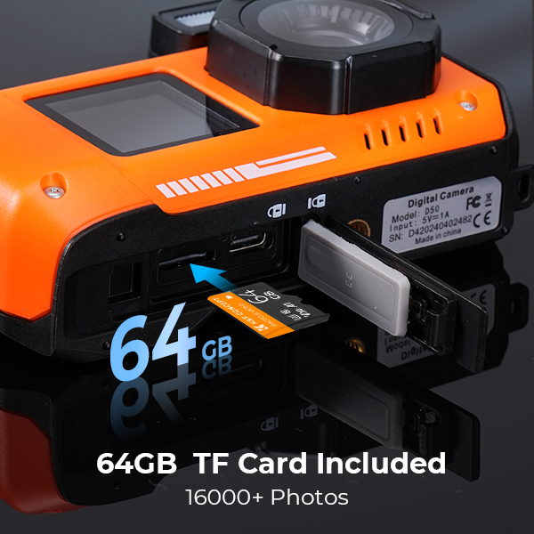 - Comes with a 64GB TF card for secure storage of all your photos and videos. Use a TF card reader to easily upload files to your PC and share memories with friends. Sealed covers protect the charging port and TF card slot, enhancing water resistance and durability.
