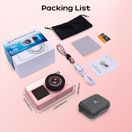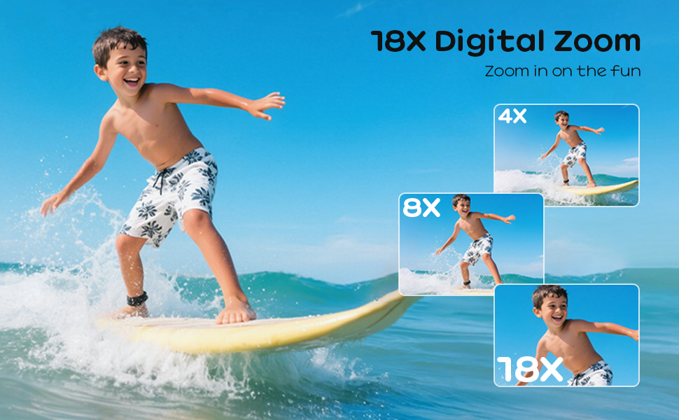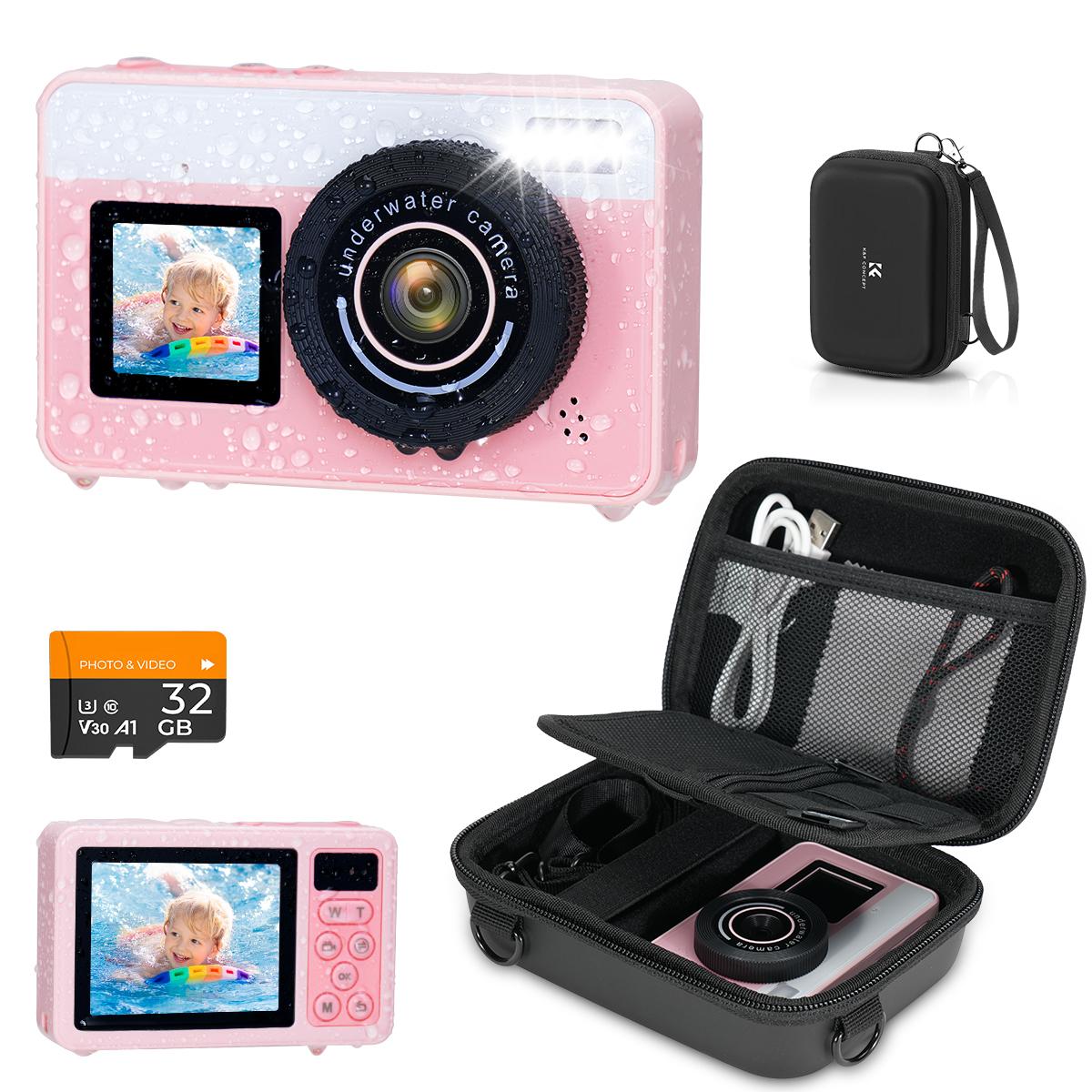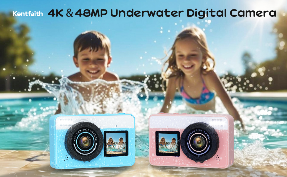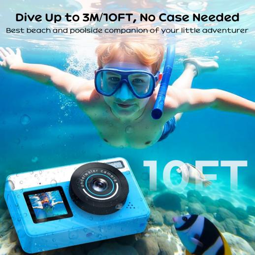 - Don't underestimate the cute kid's camera—it's a real performer. Capable of 4K/30fps video and 48MP photos, it's fully waterproof up to 3M/10FT without a case. Dual screens allow for effortless selfies, while autofocus and 18X zoom features bring the underwater world into crisp focus. Lightweight, floatable, and ready for action—this camera is ideal for vacations, poolside play, beach days, or everyday discoveries.