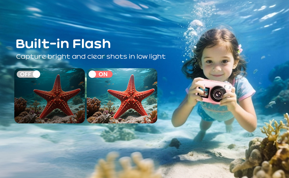 With a built-in flash, every photo shines—whether it's taken in dim light, cloudy water, or at dusk. No more dark or blurry pictures with our underwater camera for kids—just crisp, vibrant memories your child will love.