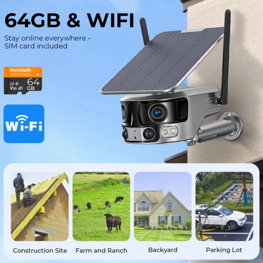 - * WiFi Connectivity & All-Weather Protection: Stay connected and monitor in real time with reliable WiFi. Stream live feed directly to your smartphone while solar charging and IP66 waterproofing keep the camera running in any weather. Includes a 2m extension cord, so you can flexibly place the solar panel in a sunny spot. And a free 64GB memory card—ready to watch anytime, anywhere.