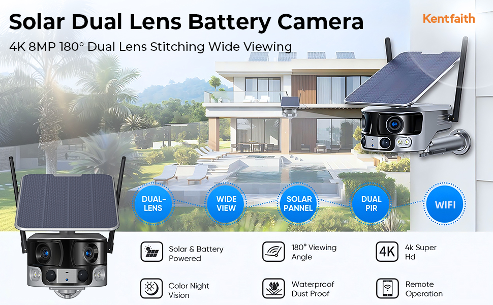 WiFi Security Camera with 4K Clarity, 180° Panoramic View with Dual Lens, Solar Powered, 360° Live View, Color Night Vision, 2 Packs, Kentfaith