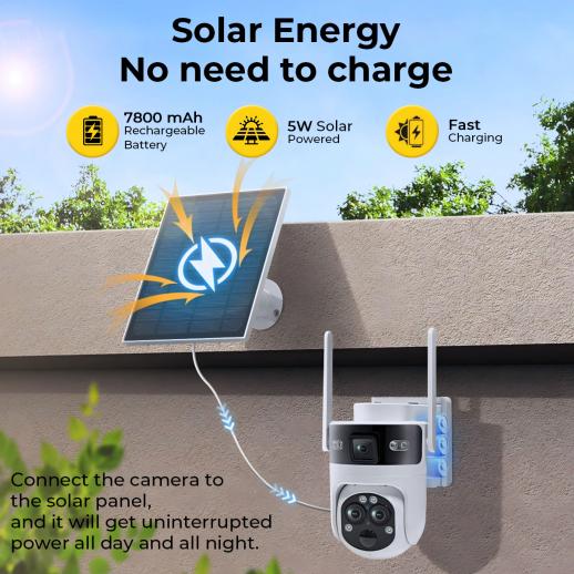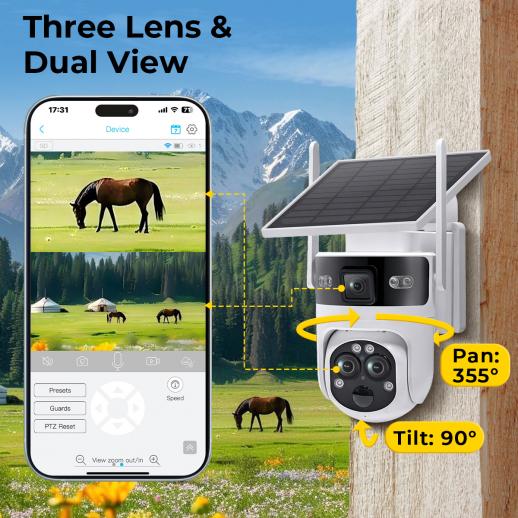 - * 3 Lenses, Dual Views, Double the Protection: With dual lenses, Kentfaith solar security camera eliminates blind spots for ultimate protection. The 120° wide-angle lens provides a sweeping panoramic view for continuous monitoring of key areas, while the PTZ lens rotates 355° horizontally, tilts 90° vertically, and 15X hybrid zoom. Guard your porch, yard, farm, or rural cabin with crystal-clear detail.