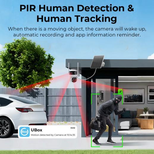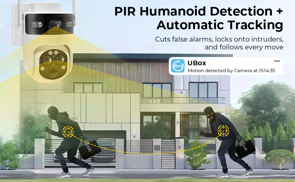 - * PIR & AI Humanoid Detection, Auto Tracking & 2-Way Audio: With advanced PIR sensors, our outdoor security cameras detects people with up to 99% accuracy, reducing false alerts from things like blowing curtains or swaying branches. The security camera enables auto-tracking of suspicious movements and built-in two-way audio for real-time communication, all controllable via the UBox app.