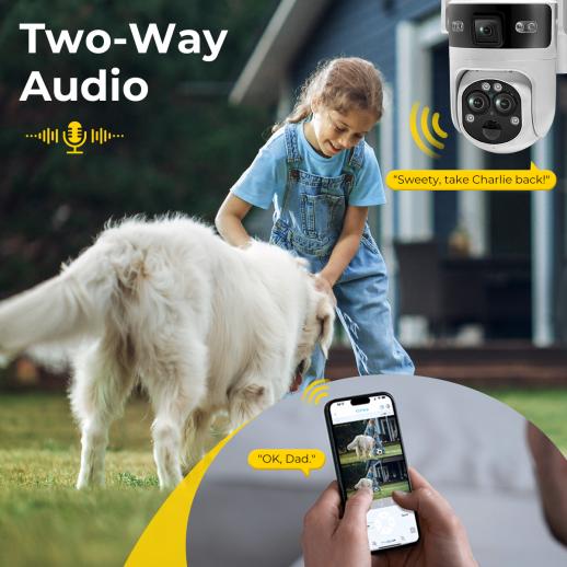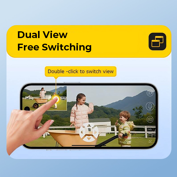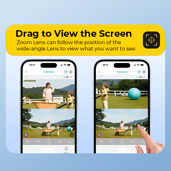 - Zoom Lens Follows Wide-Angle: When you slide your finger on the screen of the wide-angle lens, the zoom lens will automatically lock onto the same area. Follow a delivery driver walking to your door, or track a neighbor’s dog wandering into your yard. Want to see more details? Just pinch to zoom in—no extra steps.