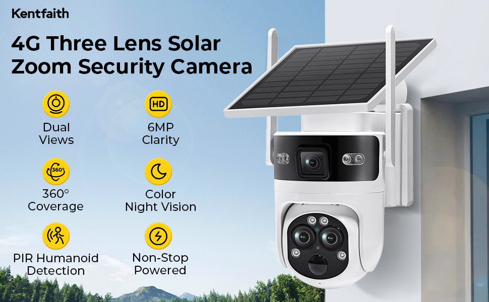 Kentfaith 4G LTE Cellular 3 Lens Solar Security Camera