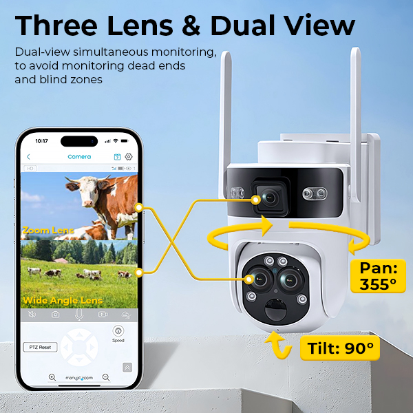 - The outdoor security cameras achieve ultimate surveillance flexibility with a 3-lens system. The wide-angle lens provides a 120° uninterrupted panorama, while the PTZ lens offers 355° pan, 100° tilt, and 15X hybrid zoom, allowing you to easily focus on key details when needed.