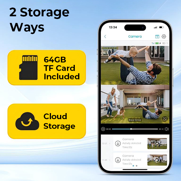- Select the storage option that best suits your needs. The 4G LTE security camera supports 128GB local TF card storage (a 64GB card is included) and offers secure cloud storage for hassle-free access to your recordings.