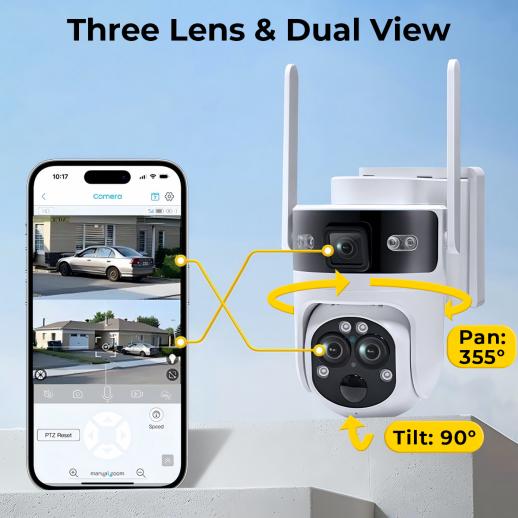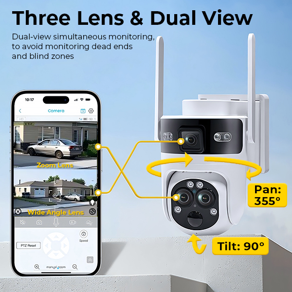 - The outdoor security cameras achieve ultimate surveillance flexibility with a 3-lens system. The wide-angle lens provides a 120° uninterrupted panorama, while the PTZ lens offers 355° pan, 100° tilt, and 15X hybrid zoom, allowing you to easily focus on key details when needed.