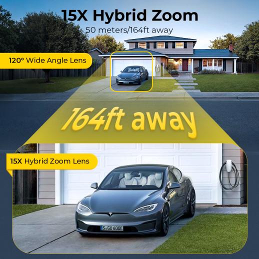 - · 15X Hybrid Zoom: Zoom in 15 times without losing clarity. Read a license plate from 164ft away, or check if your kid’s bike is still in the yard from your office.