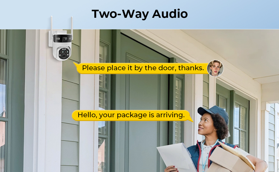 - Our outdoor wireless security camera features a noiseless microphone and speaker for instant two-way communication. Easily chat with visitors or deter unwanted visitors using your phone, ensuring you stay connected and protect your property, wherever you are.