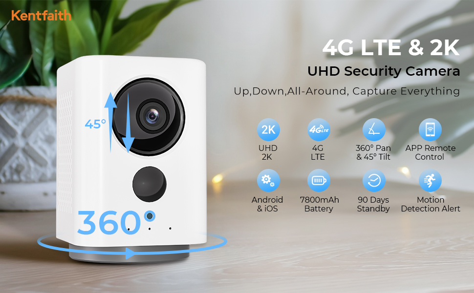 - * 100% Wireless, 360° Pan 45° Tilt & 4G Live View: Kentfaith's no wifi security camera offers easy security with 360° pan, 45° tilt and remote 4G monitoring via app. Compact, 100% wireless design lets you install it anywhere: home, car, camping trips, or while traveling. Keep an eye on your property, home, or vehicle effortlessly, so you stay secure on the go.