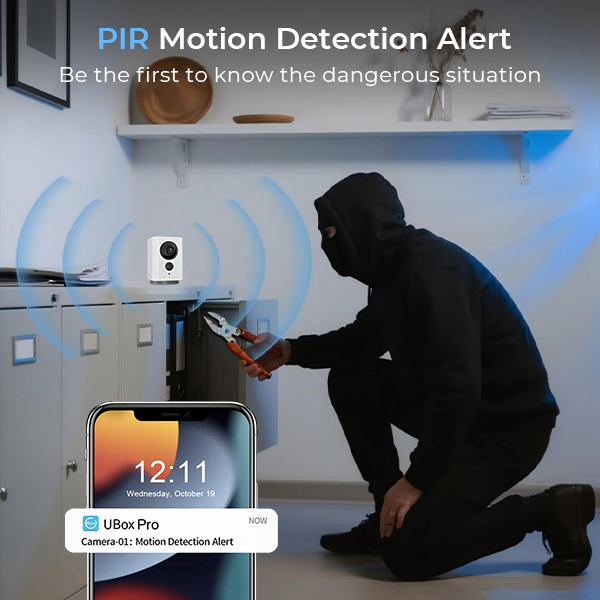 - * Motion Detection Alerts & 2-Way Talk: The PIR HD sensor triggers video recording, filters out invalid video, and sends a timely warning to your phone via the UBox Pro app to deter intruders within the monitoring range. Plus, equipped with built-in speakers and microphones, the mini camera allows you to communicate with visitors, like intruders and couriers, in real-time—enhancing both safety and convenience.
