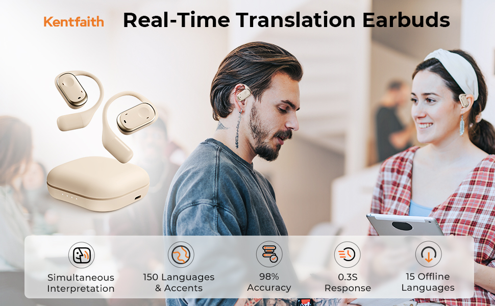 Kentfaith Open-Ear Translator Earbuds, 2-Way Real-Time Translation for Traveling, Working, Learning