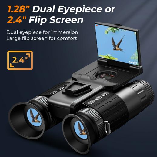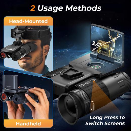 - * 【Two Viewing Modes — See Your Way】 Look through the dual 1.28" OLED eyepieces for a fully immersive experience, or flip open the 2.4" large screen to share the view and reduce eye strain. Kentfaith night vision binoculars switch in seconds between handheld and head-mounted use—keeping you comfortable all the time. Perfect for wildlife observation, camping, farm security, night hunting, etc.