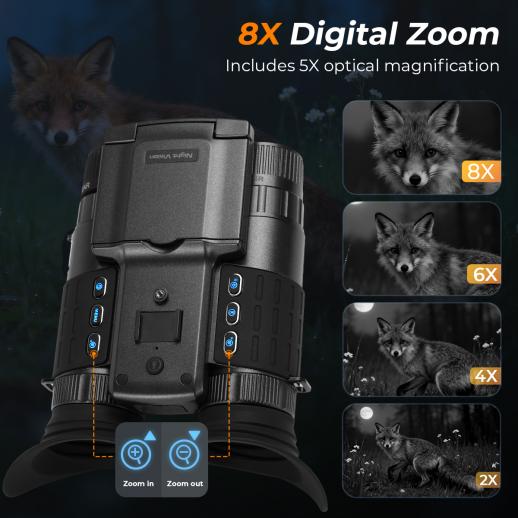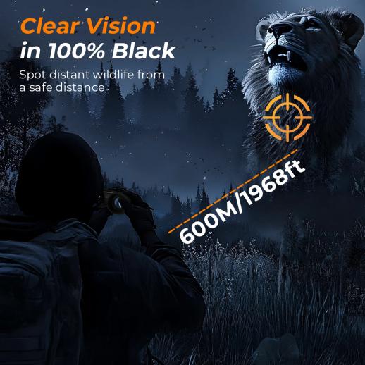 - * 【See Up to 600M / 1,968FT in Total Darkness】Powered by a 3W 850nm infrared illuminator with 3 adjustable IR levels, these IR night vision goggles deliver crystal-clear visibility even in complete darkness. Easily spot wildlife, monitor your property, or track game from up to 1,968 ft (600 m) away. With 8X digital zoom, every distant detail comes sharply into view.