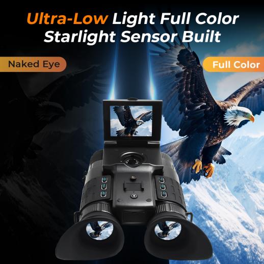 - Whether you're deep in the wild or on watch at home, this night vision device delivers uncompromising performance. A powerful starlight sensor enables full-color viewing in low light, while 600M IR night vision cuts through total darkness with ease. Capture every moment in crisp 4K video and 48MP photos, then switch seamlessly between immersive dual eyepieces and the large flip display for ultimate comfort and control.