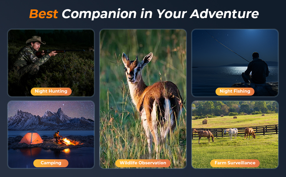 Kentfaith night vision goggles for hunting feature an integrated ultra-bright flashlight for instant illumination. Use steady light to keep your path clear, or switch to strobe mode to signal for help. No extra gear, no added weight.