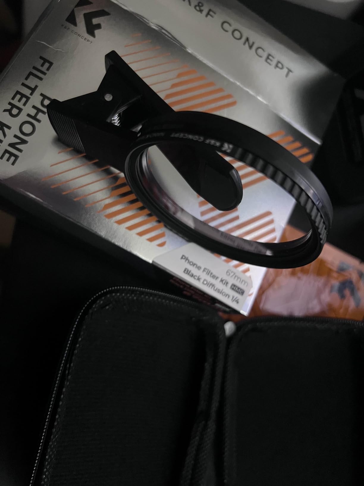 This is a great on-the-go lens filter. As a digital, mirrorless camera user accustomed to the quality of dedicated lenses, I've been on the lookout for a convenient, portable solution for my iPhone that can deliver similar results, especially when it comes to softening harsh highlights and creating a more cinematic feel. The K&F Concept 67mm Clip-on Black Diffusion 1/4 Phone Camera Lens Filter has definitely caught my attention.What immediately impressed me is the thoughtful design. The filter itself is a substantial, round, and wide piece of optical glass that easily covers all the lenses on my iPhone, ensuring consistent diffusion across the entire frame. The included clip-on mechanism feels secure and makes attaching and detaching the filter a breeze – perfect for those spontaneous moments when you want to add a touch of softness without fumbling with adapters. It even comes with a handy case to keep the filter protected when not in use, which is a nice touch.The real magic, however, lies in the effect this filter produces. What I appreciate most is how it subtly softens the image without requiring extensive post-processing or image correction. It takes the edge off bright highlights, creating a gentle bloom and a more pleasing aesthetic, particularly noticeable in situations with strong light sources (as my accompanying photo demonstrates). This diffusion effect lends a touch of elegance to photos and videos, moving away from the sometimes overly sharp and clinical look that phone cameras can produce.While it won't replace the nuanced control of a dedicated lens on my digital mirrorless camera, this diffusion filter offers a fantastic way to achieve a similar softening effect quickly and easily. It's an excellent tool for anyone looking to add a bit of cinematic flair to their videos or create softer, more flattering portraits without relying heavily on editing apps.Pros:-Provides a pleasing softening effect, reducing harsh highlights, without overdoing it!-Convenient clip-on design for quick attachment and removal.-Wide, round lens easily covers all iPhone cameras.-Comes with a protective carrying case.Cons:-Right now I don't have any!This Black Diffusion 1/4 Lens Filter is a valuable addition to any mobile photographer or videographer's toolkit. It works well and is a great value.