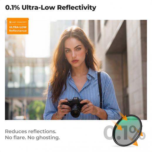 The filter employs ultra-low reflectivity technology, with a reflectivity as low as 0.1%, effectively reducing glare and ghosting caused by the filter. CPL's anti-reflection function eliminates reflections from object surfaces, not glare or ghosting in the image.