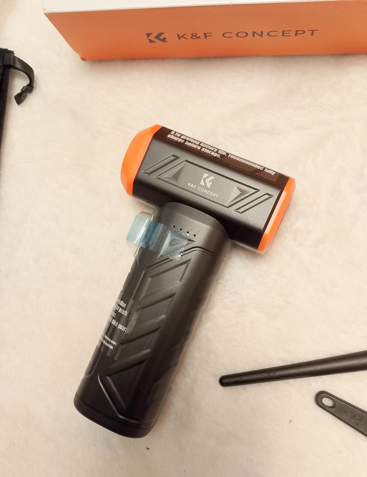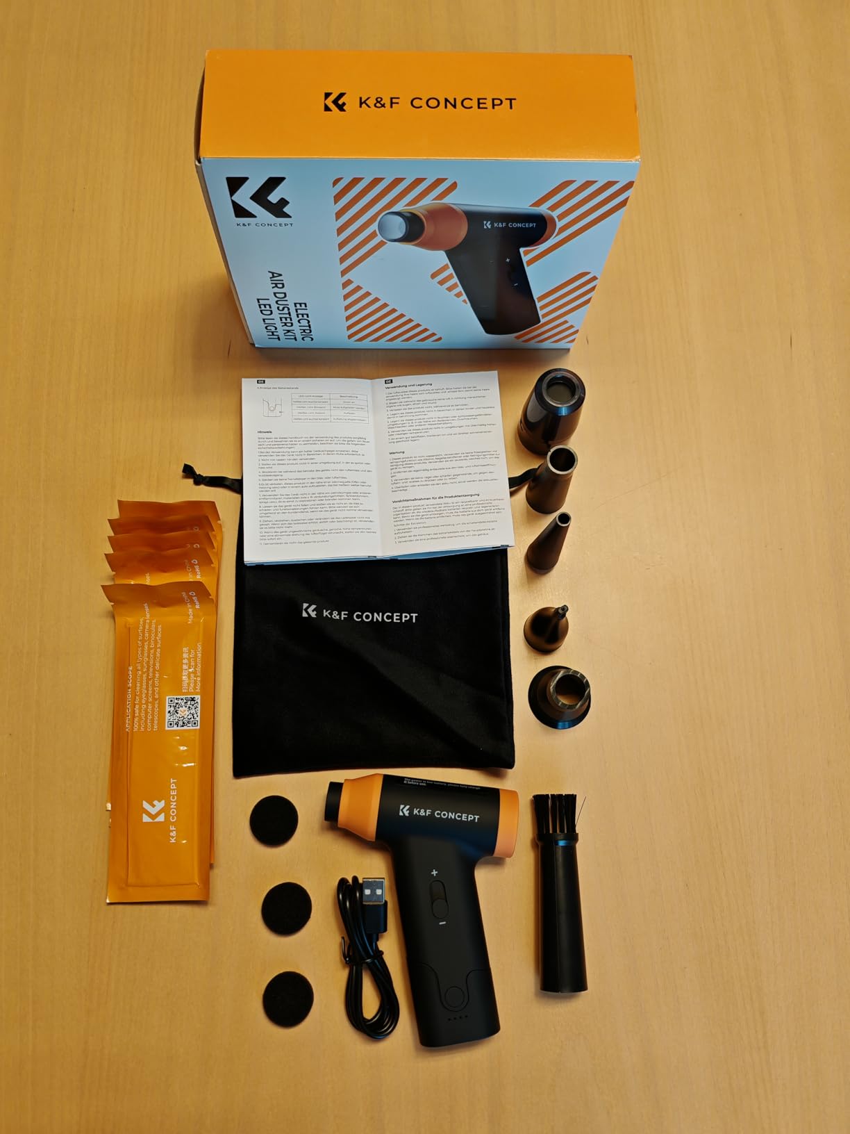 I ordered the K&F Concept 2-in-1 electric air blower and it performs well. The brushless motor runs at 150,000 RPM, achieving a maximum wind speed of 54 m/s. It has a built-in 5000 mAh battery, which can be recharged via a USB-C cable. The device is operated using only a button and a slide switch. The button toggles between different functions: a long press turns the blower on/off, a single short press turns the light on/off, and three short presses turn the vacuum on/off. The slide switch allows you to adjust the blowing and vacuuming power. Various attachments for blowing and vacuuming are included.