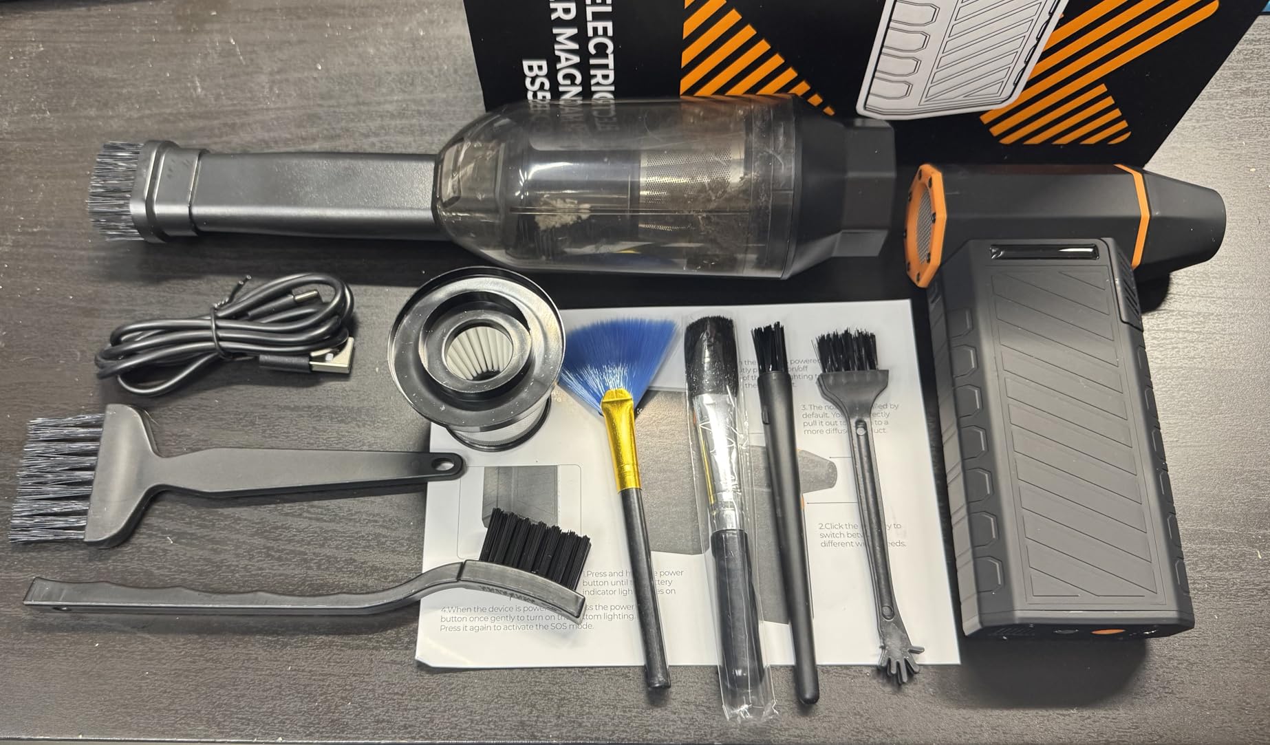 Great little vacuum that is perfect for cars and trucks. Kit comes with a extra filter and a wide variety of brushes to help get in the tight spots. I was amazed at the amount of power this blower puts out. It is so powerful that I use it to clean in my house. Easy to put all the attachments on the blower. The battery last for over an hour on a 30 minute charge. When you pick up the blower you can feel the quality in workmanship. Made with durable material. Cleans really well. One of the best things about this is the price. Really great deal.