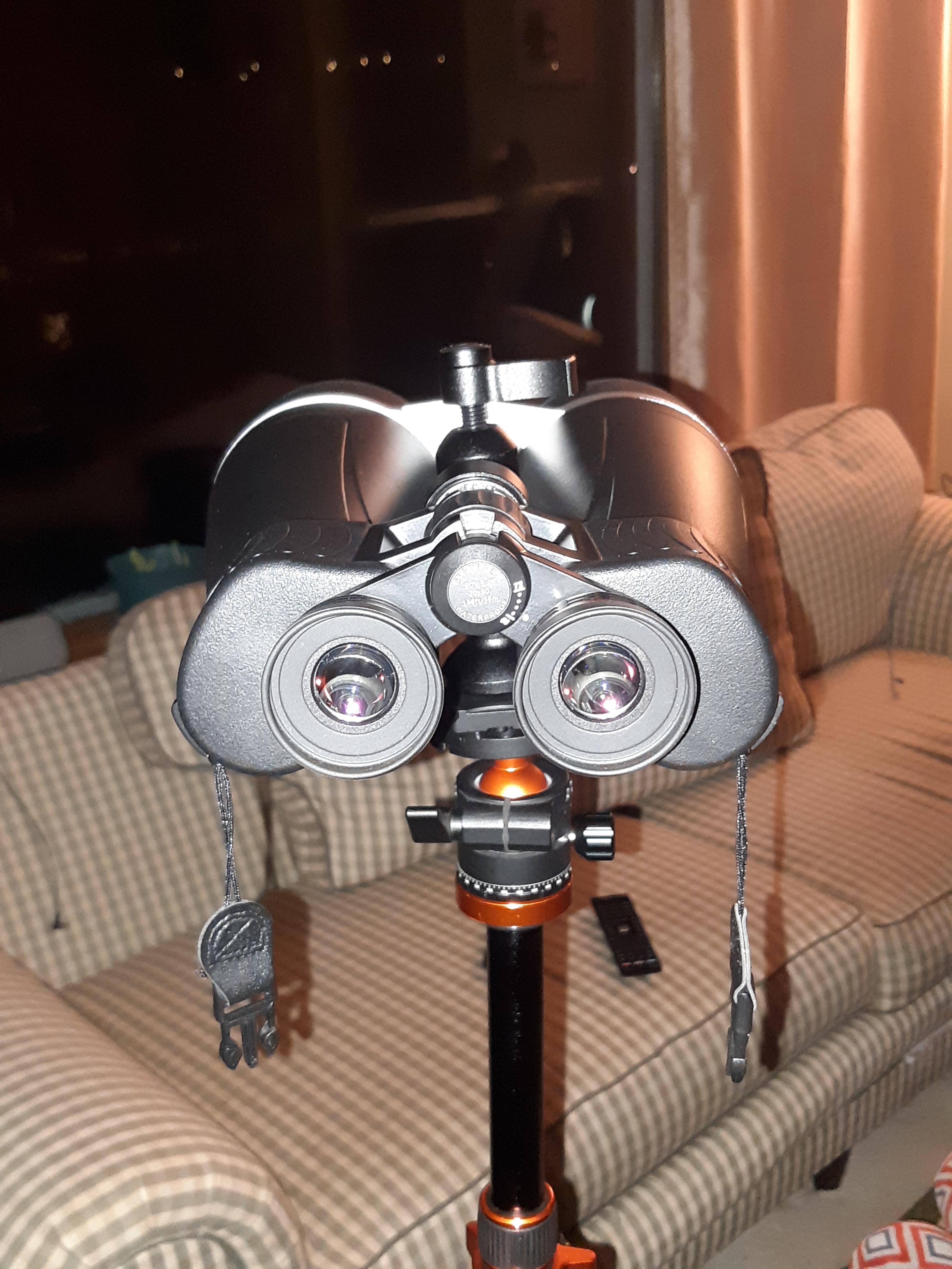 Awesome tripod for my Celestron Skymaster Pro 20x80 Binoculars. Make sure you lock the 360° ring nob along w/the other ones & it'll be very Secure.. I enjoy the 360° rotate and how you can choose what height you want with lots of options. Also easy2 open & close up. I like the ball rotater nob to view in all directions. Good price & Sweet Bag they give you. Idk why the shoulder strap is put on opposite side of regular handles but it's cool I guess.