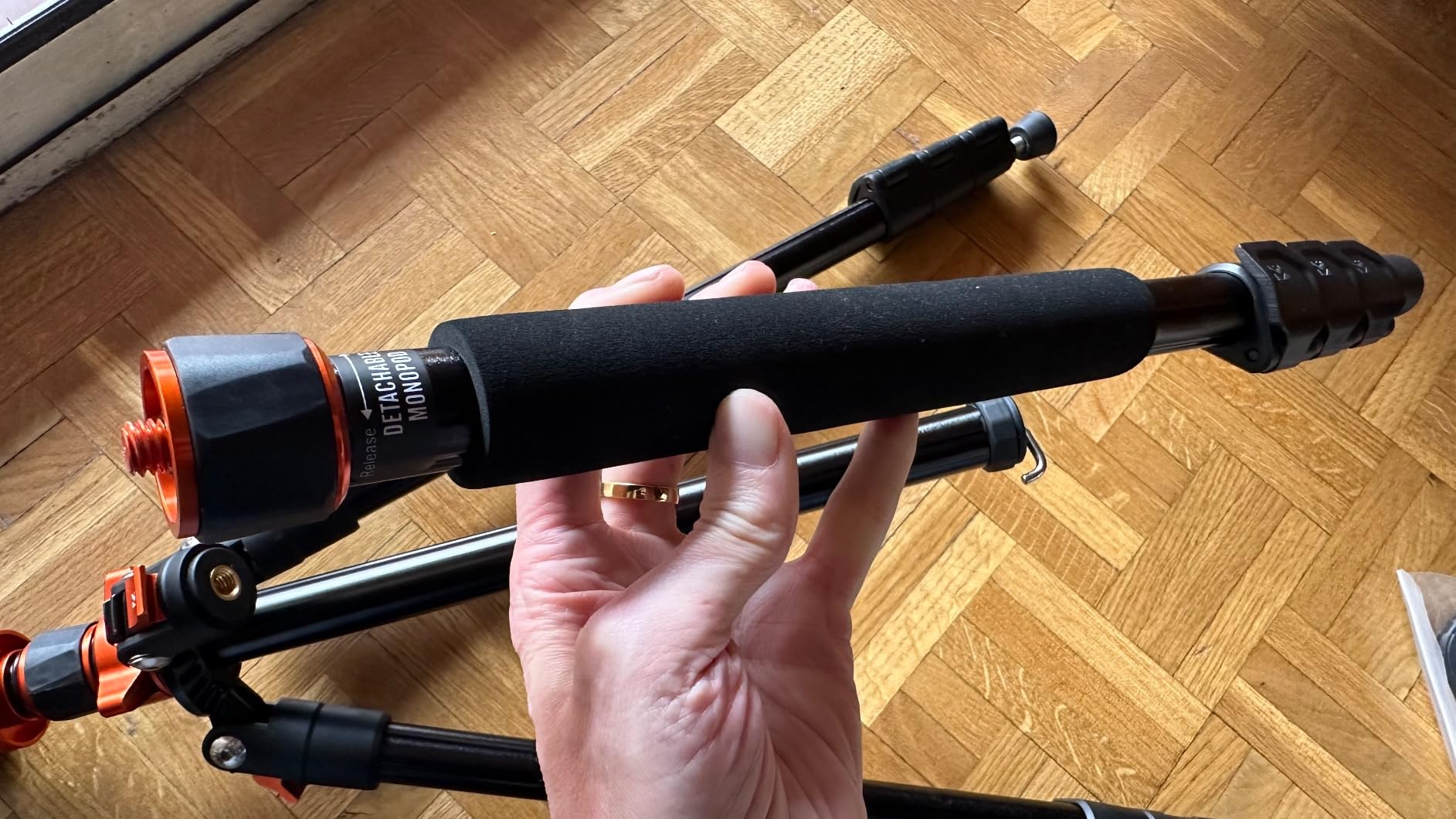 Just unscrew one of the legs that the tripod has and place the head on it to turn it into a monopod so you don't have to carry another load of stuff with the equipment because you don't know for sure if you're going to need it or not.