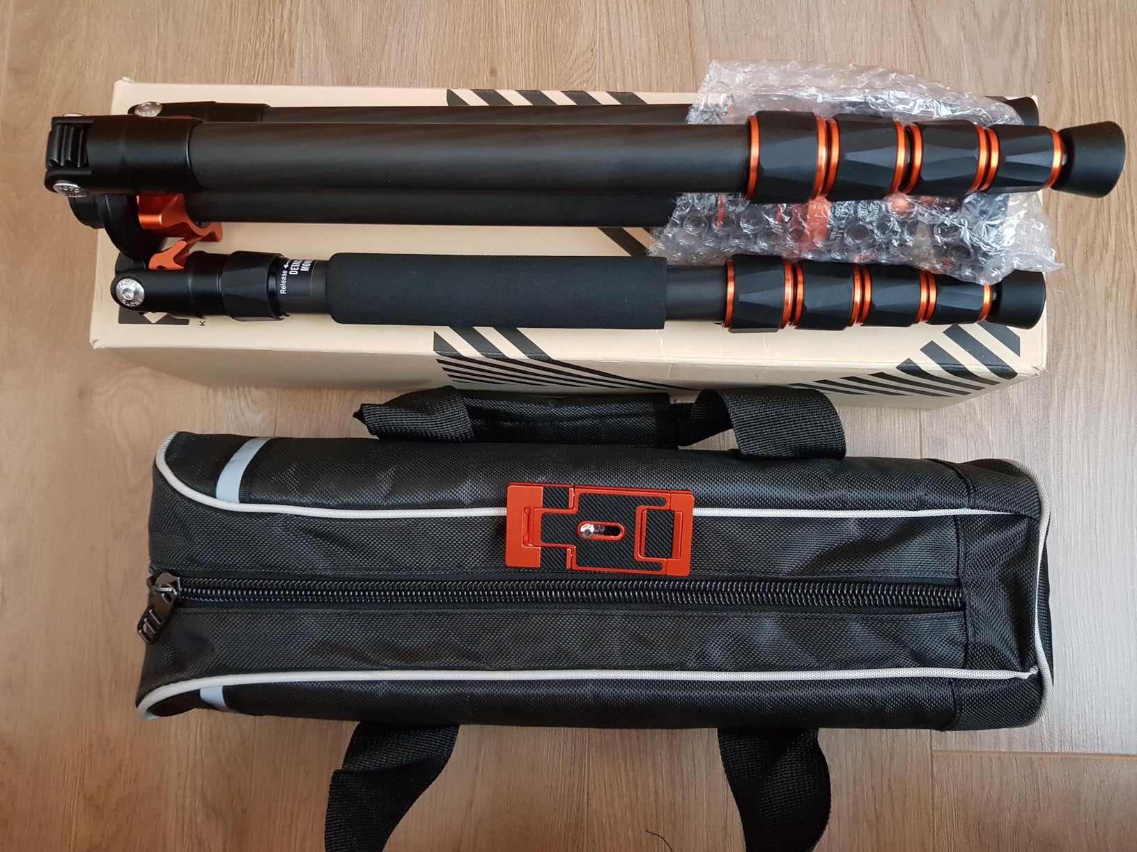 First impression out of the box, this is very good looking tripod, with nice orange accents. But it is not all about looks so how does it function. Supplied with a good quality case, shoulder strap and additional mount for phone (which can also be used on a camera). The tripod functions like most these days, the twist locking mechanisms on the legs work well and secure the legs firmly in place when fully extended, or any other height combination required. The smallest leg section when at full extension will get you out of a jam, but there is some flex, especially if the legs are at the maximum angle/span, so maybe not use this for long exposures/windy locations. Personally I will probably leave them left in, unless desperate, and just have the tripod at a lower but more stable height. I like to work at low level when using travel tripods for maximum stability, unfortunately it does not have an additional small/3 inch low level column so the center column needs to be extended, but with 2 leg extensions on each leg set at the maximum low level position it provides a good solid base for a DSLR and Filter system. This is not a deal breaker but would have been a nice addition. The head itself is a typical ball type, fully adjustable, and it seems well made and secures a DSLR and small zoom/standard lens combo firmly in place at any angle. The overall unit weight itself was 1400g, so ever so slightly over the advertised weight on my scales. It is 400g lighter than an aluminium travel tripod I have and the difference is noticeable. That said I am yet to try it in a backpack but I am wondering if I should have gotten the lighter version again (1000g). Time will tell. So first impressions are this is a very good looking, solid, stable, good value multi functional travel tripod. I am very happy with the purchase at this point and would definitely recommend this K&F product and the K&F brand as a whole. I will post an updated review when I have had the opportunity to travel with the tripod and use it fully when out and about.
