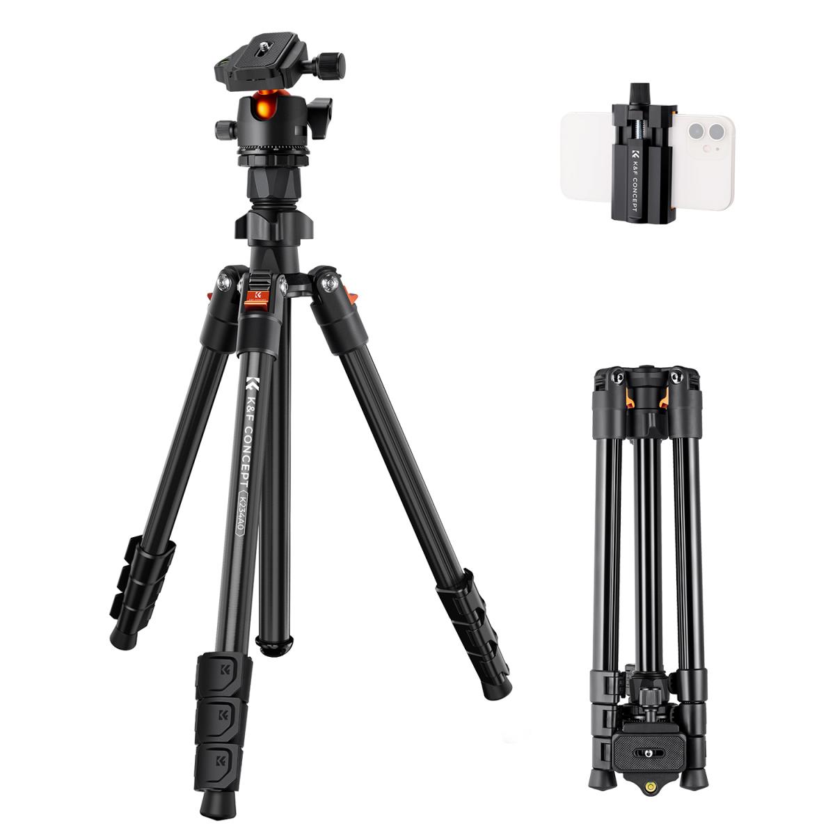 K&F Concept’s 64-inch tripod is lightweight, and a good price for a travel tripod. It easily folds up for transport, and is sturdy when deployed. The phone clamp it comes with is stout as well, and accommodates phones of various sizes. The orange highlights are a nice touch as well. My only wish is that it had an azimuth panhandle, but that’s a common flaw in most travel tripods. It will hold lightweight payloads (a phone, DSLR with a small lens, a small spotting scope etc).