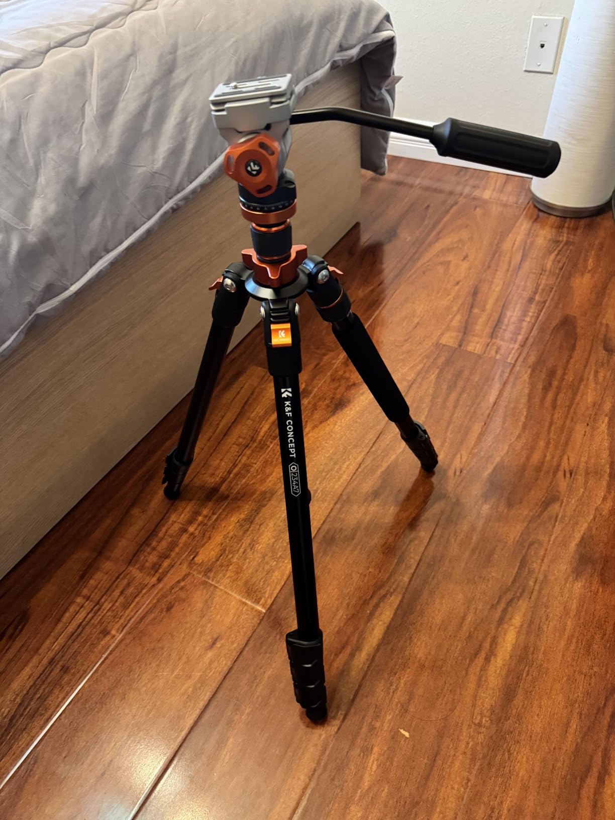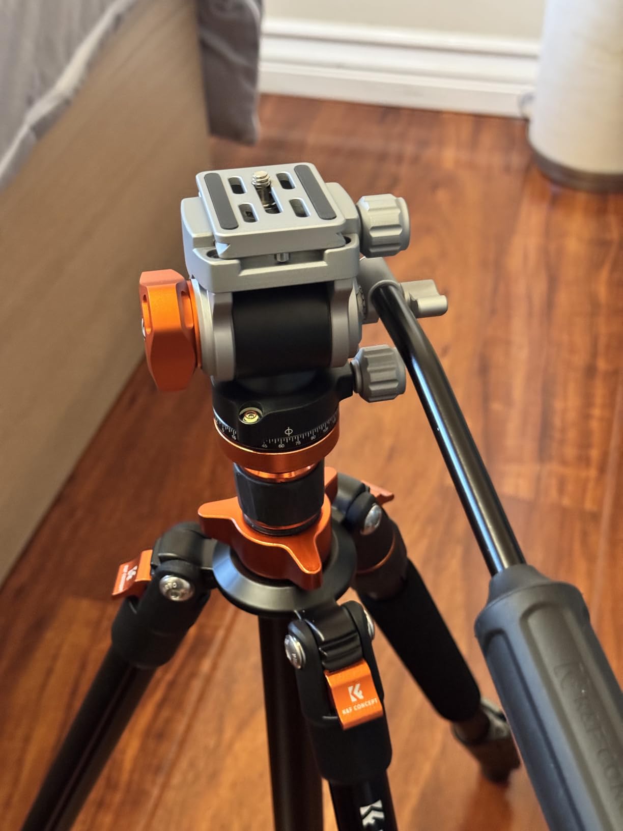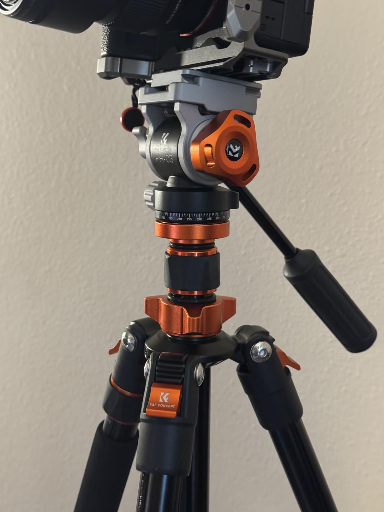I recently acquired K&F Concept 83 Video Tripod. I am photographer and don’t do much video. But when I do, my tripod which is geared mostly for photos, did not yield good results. That’s one reason I wanted a dedicated video tripod for those occasions where I use my camera (soccer, school plays etc). I wanted a small, portable yet sturdy that operates smoothly while panning the camera. Also I did not want to spend an arm and leg. That’s when I ran into this tripod. This not only checked all boxes but within my price range. I was not expecting much given the price and all the features listed. But after receiving it and setting it up. I am pleasantly surprised. Tripod came in a cardboard box with a carrying case and a wrench. Tripod has aluminum body so it’s slightly heavier than a typical carbon fiber model. It’s much lighter than the aluminum tripod I had earlier. If you haven’t read the details, you could easily think of it’s a carbon fiber model. I felt more confident with its weight as it presented with a much better build quality. Coming to tripod legs, they are strong, with leg locks. I like these locks much better than the regular twisty cylindrical/rotating locks. This tripod leg locks have resistance and give you a Solid click sound when you engage them. When the tripod is fully extended. It becomes 83 inch tall behemoth making you look like a lilliput. While it’s good to know it can go that tall, I would never go beyond 72 inches in practical use. Now coming to the best part of the tripod - it’s head moves buttery smooth when you pan. Using handle on this tripod to pan the camera is a joy which I really missed while using a camera tripod. The upward and downward motion is also smooth. The arca Swiss compatible plate is a machine finished aluminum, unlike the regular plasticky ones that you find on other tripods. Now coming to color scheme on the tripod, when I saw on the pictures, I felt it’s cheesy until I saw the tripod in hand. After assembling and looking at the tripod, it’s black legs, coupled with orange accents along with aluminum finished tripod plate, I kind of liked the overall color scheme. It looks and feels like a premium build. I took this to film a community event in my neighborhood and performed flawlessly! By the way did I mention, it comes with a carry bag made with strong denier fabric. Overall I am more than pleasantly surprised with this tripod in terms of its quality, function and affordability. If you are in the market for a video tripod, you should seriously look this K&F concept 83 tripod. It’s an affordable premium quality video tripod. You will not be disappointed!