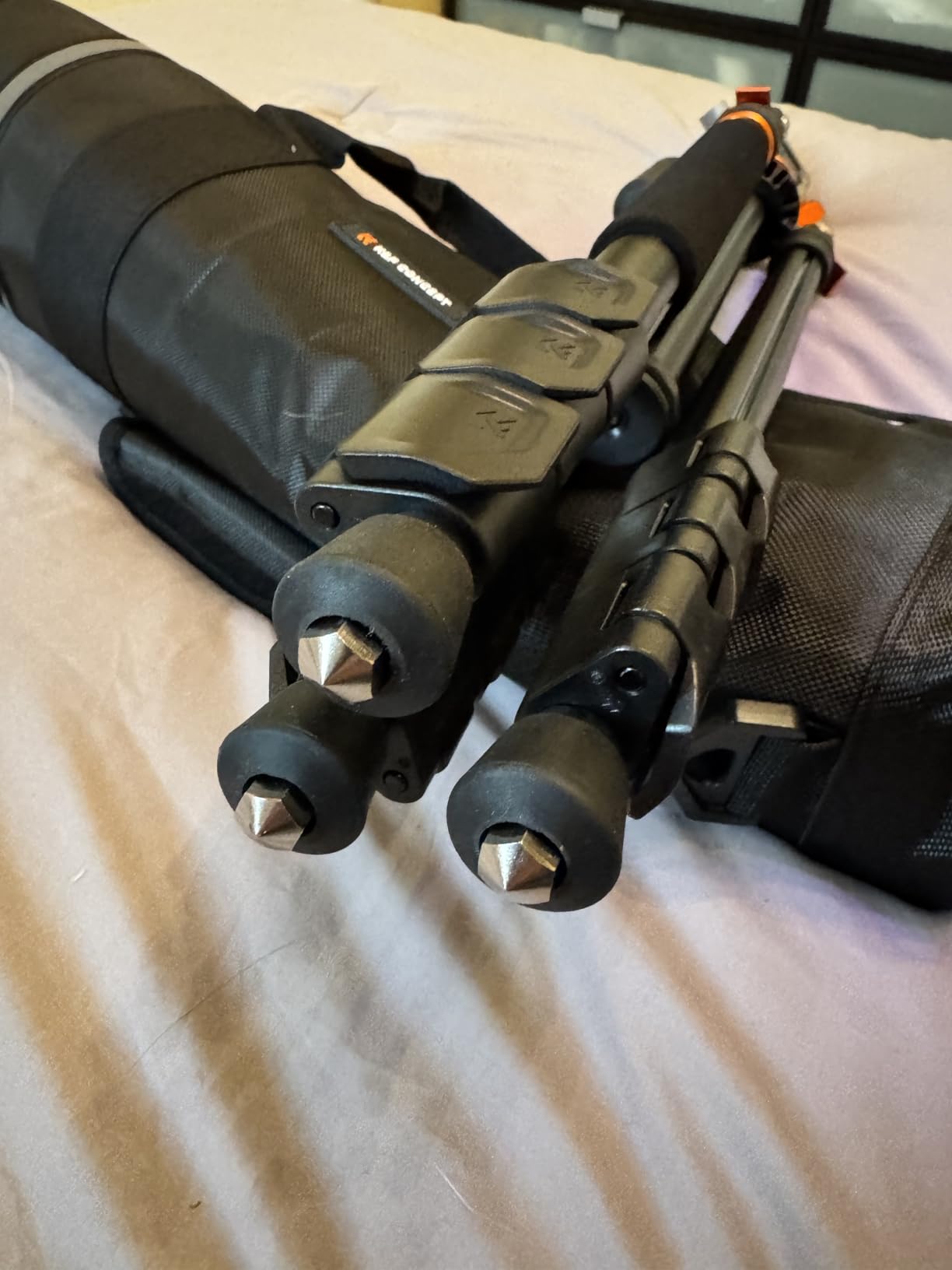 The tripod is very compact and light. I like that I can convert it into a monopod if I wanted to. Setting the tripod up was quick and easy. Putting it back into the bag is just as easy. The tripod head movement is smooth and quiet. The tripod looks and feels good. The bottom of the tripod legs are metal spikes which will dig into dirt etc for better stability.