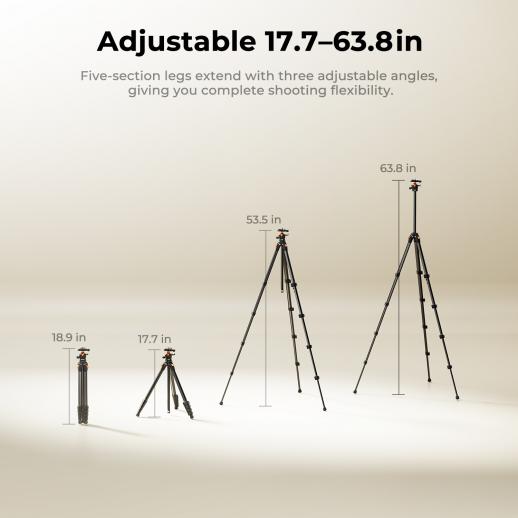 - * 【Flexible Height Adjustment】With a 5-section leg design and adjustable 3-stage leg angles, the tripod offers a height range of 17” to 63”, allowing users to quickly set the desired height, making it versatile for various shooting situations.
