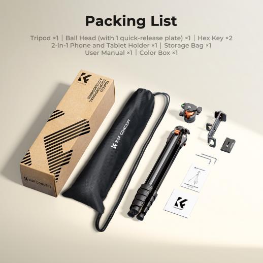 63" Aluminum Travel Camera Tripod with Arca-Compatible Ball Head, Compact Portable Lightweight Tripod Weighs 2.6 lb, Max Load 22 lb for DSLR Mirrorless Spotting Scope iPhone Teleprompter K&F CONCEPT