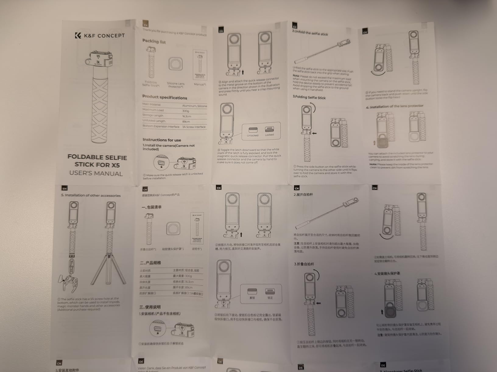 - * [Foldable Selfie Stick for Insta360 X5]: This selfie stick from K&F Concept is specially designed for Insta360 X5, featuring magnetic quick release with safety lock, foldable, easy to install and storage, ready to go