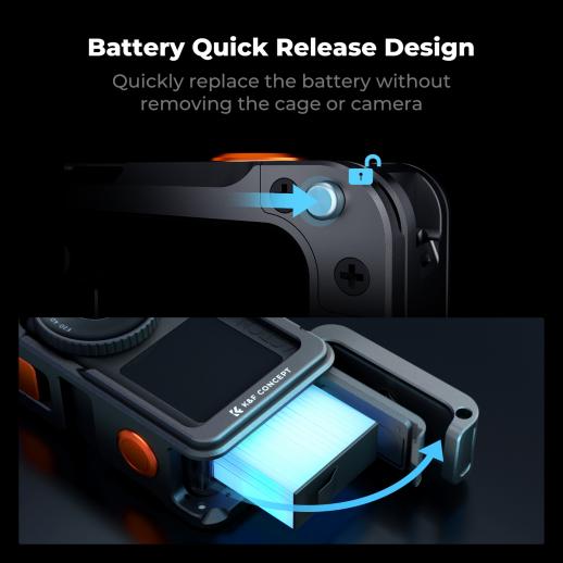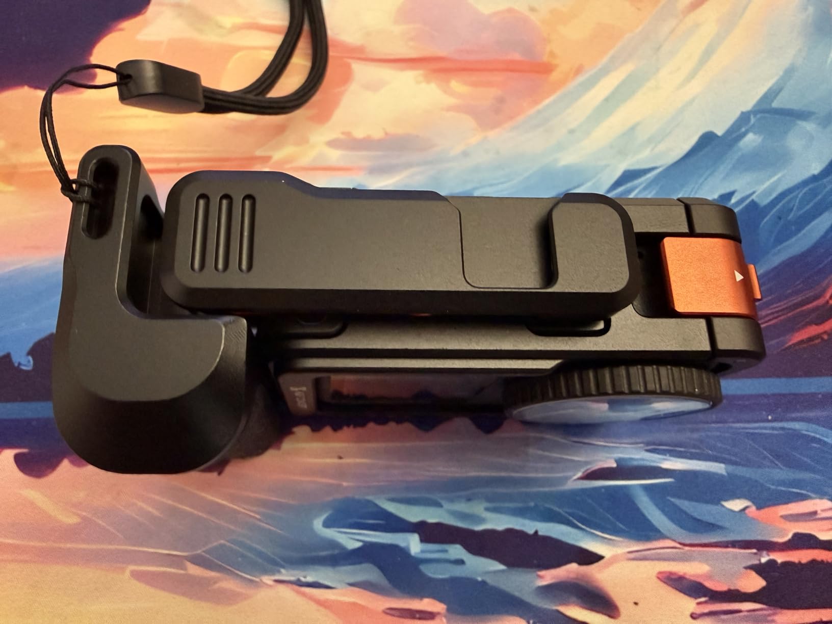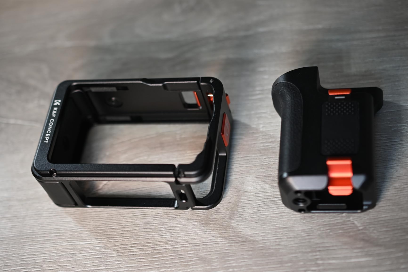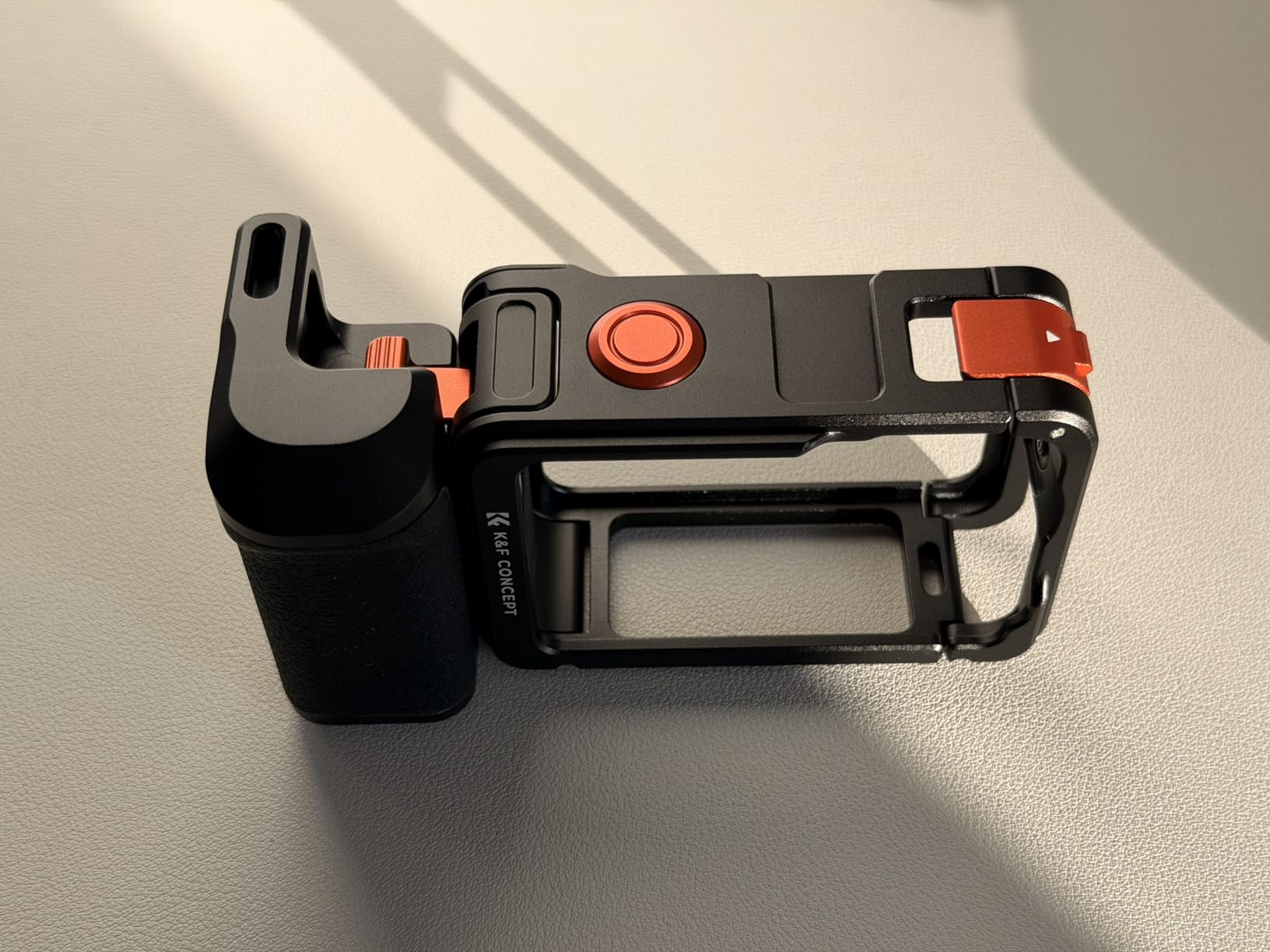 The hand grip attaches firmly to the cage body, and is easily removed by squeezing the 2 orange clips on the integrated Quick Release mount. (Orange appears to be the corporate colour for K&F CONCEPT, it appears on every accessory of theirs I have!) In use the hand grip / release bar makes taking photographs with the Action 6 much easier - very little pressure is needed to operate the release and the grip is large enough (although a little deeper would be excellent) to provide good support and stability in use. I suggest using the provided wrist strap (with safety sliding loop) to provide added security to for the camera, as well as keeping it 'handy' for immediate use.