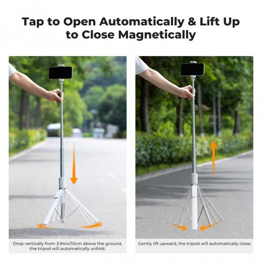 - * Automatic opening and closing: K&F selfie stick tripod opens automatically when dropped 10 cm. Its built-in magnet allows you to close it with one hand by lifting it. Convenient and intuitive. The included wrist strap for the remote control avoids any risk of loss