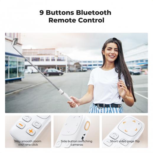- * 9 Button Bluetooth Remote Control: Rechargeable remote control allows you to take photos, zoom, change cameras, liker and browse videos. Versatile, it transforms into a floor, desktop or selfie stick tripod, perfect for content creators